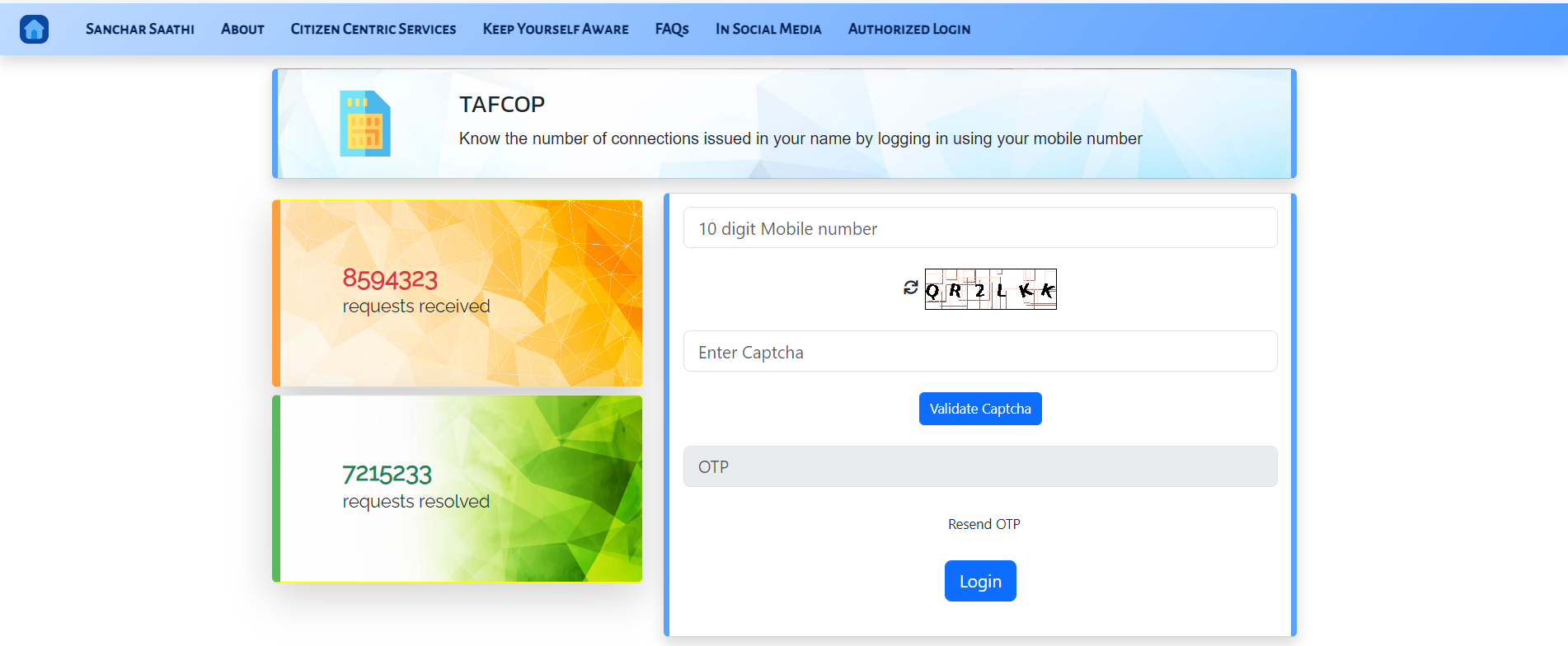 भारत सरकार द्वारा धोखाधड़ी फर्जीवाड़ी और अन्य समस्याओं को देखते हुए इस पोर्टल की शुरुआत की गई है | इस पोर्टल के माध्यम से नागरिक यह जान पाते हैं कि उनके नाम से कितने सिम चल रहे हैं और अगर कोई सिम गलत चल रहा है तो वह उसे बंद भी कर सकते हैं | यह भारत सरकार द्वारा संचालित एक आधिकारिक पोर्टल है | TAFCOP एक ऐसा पोर्टल है जो वह दूरसंचार डाटा का उपयोग करके धोखाधड़ी की पहचान करके और उसे रोककर ग्राहकों के हितों की रक्षा करता है |